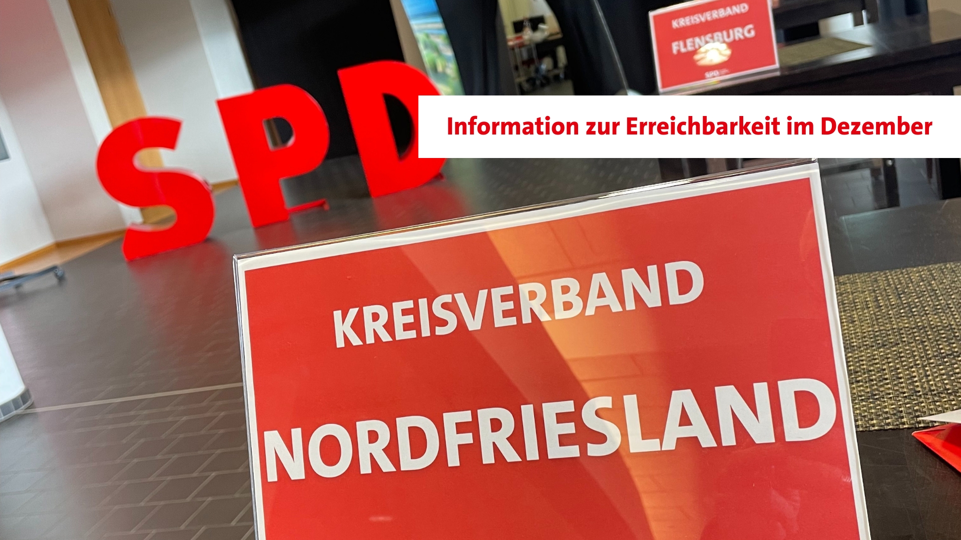 Im Dezember gelten für das SPD-Kreisbüro Nordfriesland geänderte Öffnungszeiten. Bitte beachtet, dass das Büro in dieser Zeit nur eingeschränkt erreichbar ist. Für dringende Anliegen empfiehlt sich eine Kontaktaufnahme per E-Mail. … Weiterlesen